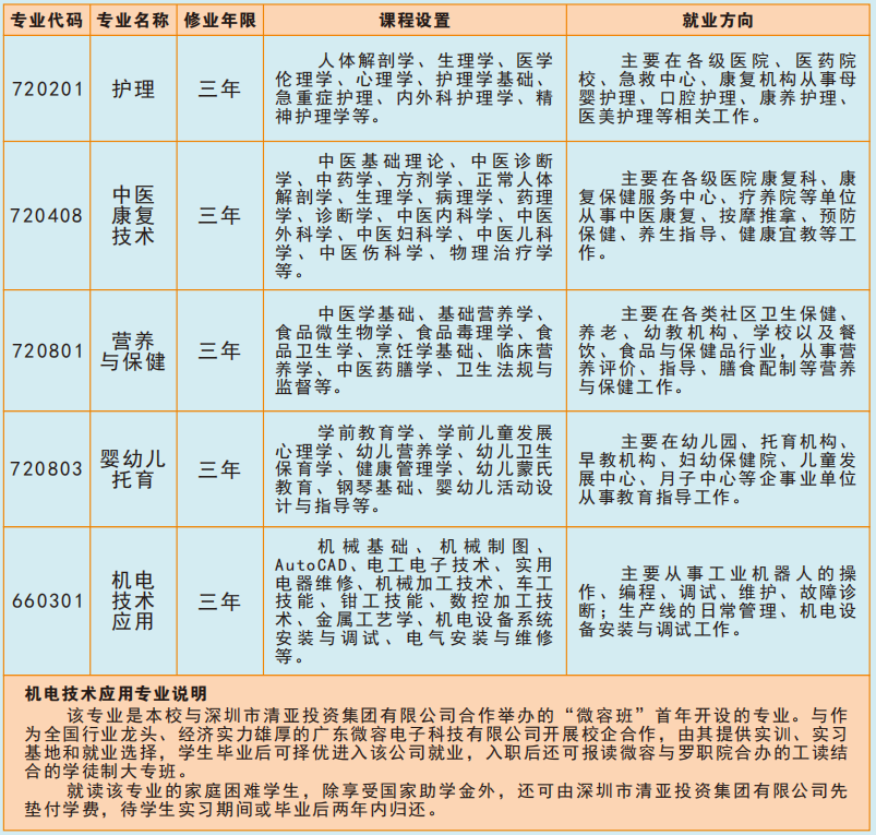 2023年首設(shè)五個專業(yè),分別為護(hù)理、中醫(yī)康復(fù)技術(shù)、嬰幼兒托育、營養(yǎng)與保健、機(jī)電技術(shù)應(yīng)用,這些專業(yè)都可與高職及應(yīng)用型本科相貫通。后續(xù)將根據(jù)區(qū)域經(jīng)濟(jì)發(fā)展需求拓展其他專業(yè)學(xué)科。